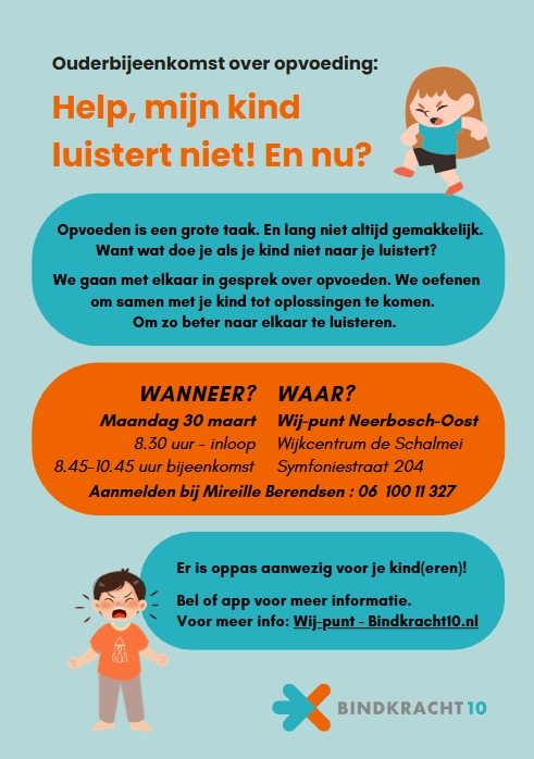 Opvoeden is een grote taak. En lang niet altijd gemakkelijk. Want wat doe je als je kind niet naar je luistert? Bij deze bijeenkomst gaan we met elkaar in gesprek over opvoeden. We oefenen om samen met je kind tot oplossingen te komen. Om zo beter naar elkaar te luisteren. Meer info bij Mireille. Of loop even binnen bij Wij-punt Neerbosch-Oost!