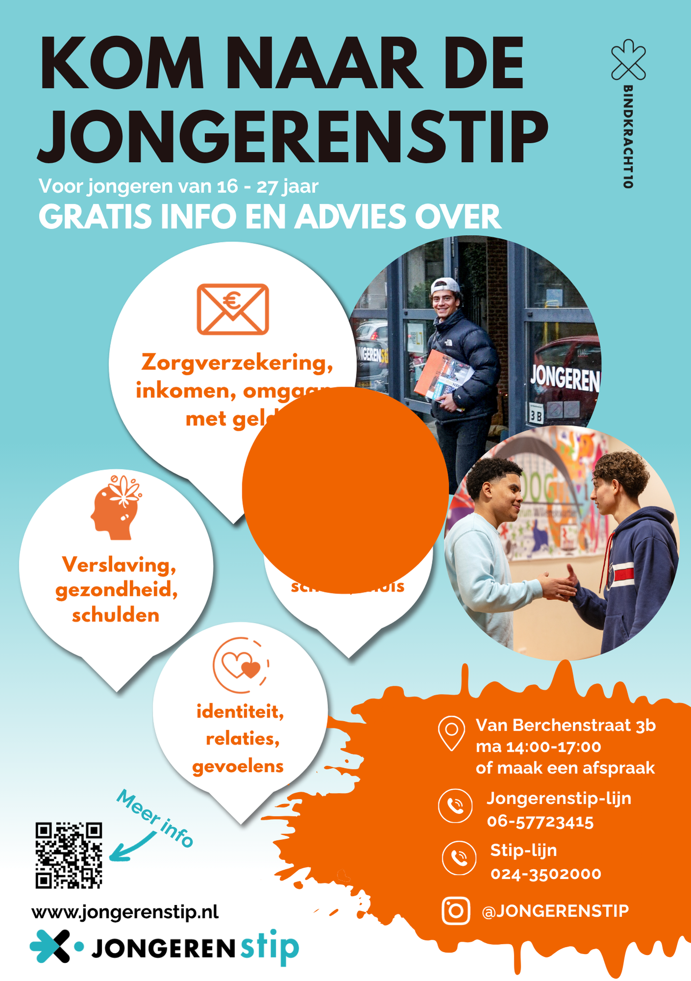 Bij de jongerenStip krijg je informatie of advies op al je vragen. De vrijwilligers staan klaar voor alle jongeren in Nijmegen. Heb jij een vraag over inkomen, seksualiteit, zorgverzekering, schulden, gezondheid, sociale contacten, opvoeden, vrienden, school, gevoelens, discriminatie, omgaan met geld of over jouw thuissituatie? Kom dan langs bij de jongerenStip.